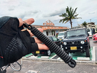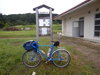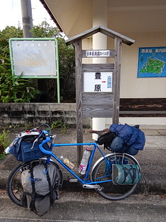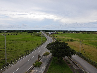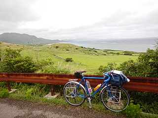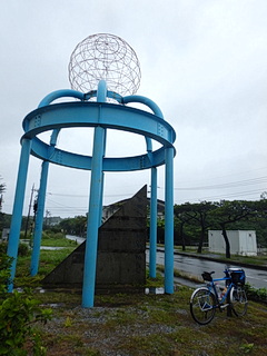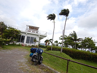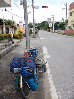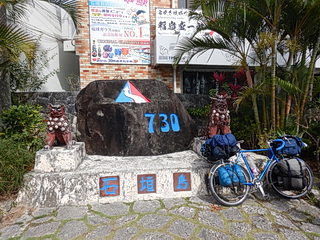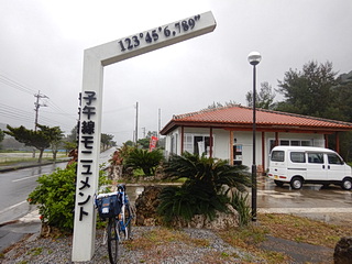 商店街でじゅーしーおにぎりとかまぼこを買っていく。産直で野菜も手に入れる。これで買い出しの一次は完了した。後は途中にあるイオンで買えそうだ。石垣港を出発して国道を進んでいく。まず、コンビニに立ち寄っていく。国道沿いのファミリーマートが日本最南端のコンビニになる。最南端や最西端がいっぱいあるので石垣島での買い物では見逃せない。また進むと道が南に湾曲したところで立ち止まる。ここは目印も何もないのでスマホの画面を見てGPSで特定するしかない国道の日本最南端に到達する。カフェの前に自転車を置いて一人ガッツポーズをしている。周りは何に対して喜んでいるのか予想はつかないだろう。国道の日本最北端・最東端は北海道で何回も行ったし、先ほど日本最西端は制覇していたので、これで国道の4極を自走で制覇したことになる。 |