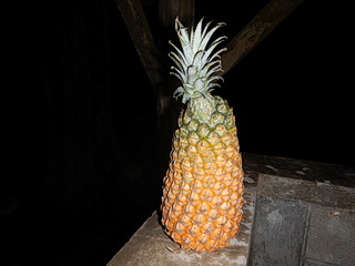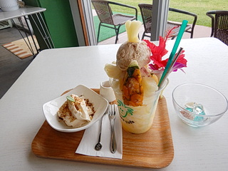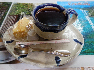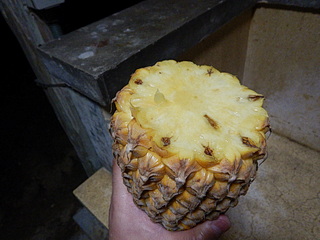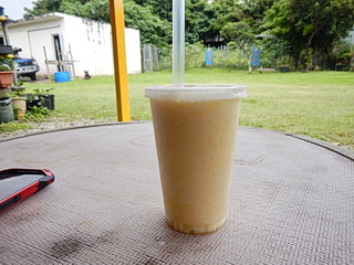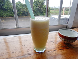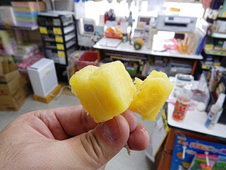 あと少しで伊野田というとろこで石垣島産のコーヒーを飲める喫茶店に立ち寄る。甘いバームクーヘンとブラックのコーヒーが合う。コーヒーの味の違いが分かる人ではないが、すっきりして飲みやすい印象である。ここ最近は毎日のようにコンビニのコーヒーを飲んでいるし、旅の中でも美味しいコーヒーにこだわれると楽しそうだ。何より石垣島まで南下するとコーヒーベルトである北緯25度にさしかかるのでコーヒー産地になっても不思議では無いが、まだまだ豆だけ販売するほどの数は取れないので貴重な喫茶店である。コーヒーを飲んでる間に少し雨が降ったようだが小雨のうちにあがった。続きを少し走ると今度はパイナップル農園が右側にあった。ここにも立ち寄る知念商会で食べさせてもらったのが忘れられず旬のパイナップルを買っていく。