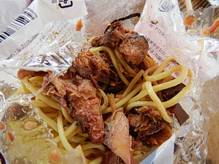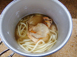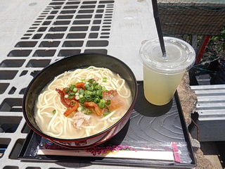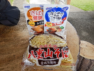 昼飯の材料は手に入ったし食べる見通しも立ったので、次は場所を選ぶ。島の中心から少し港寄りに進んだところに展望台があるので、そこで食べる。東屋の下のベンチとテーブルで作る。八重山そばの袋を開け、サバ缶パックの醤油味と味噌味を混ぜ込む。具と汁を入れて具を袋の上から握りつぶして揉み込む。キュウリをかじって袋の口から割り箸を突っ込んでサバ缶の味が混ざったそばを食べる。意外とぼそぼそとはせず食べやすい。素朴な味だがクセになる。夢中で食べてペットボトルの水道水をがぶ飲みする感覚が気持ち良い。素朴だが八重山らしい食を楽しめた。