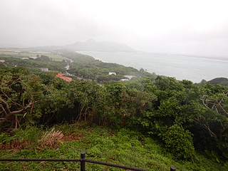 しばらく走ると玉取崎の展望台に着く。明らかに天気悪くて眺めは期待できないが身軽なので坂道を上ってみる。曇って霧のかかる海岸線はコントラスト70%減ぐらいにした写真のような状態で、晴れてるときの景色を想像させるだけの海の色は見せつつ鮮やかさには欠ける。遊歩道はアダンの実がなっていて月桃の花が満開になっている。考えてみると餅と一緒に蒸せば香りが出て茎は工芸品になって花もきれいでGWの沖縄を彩る月桃は偉大に感じる。