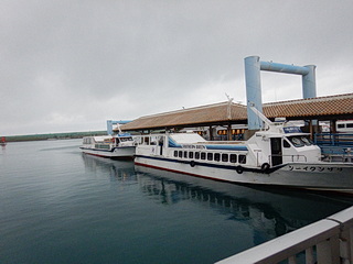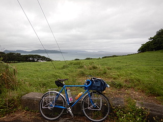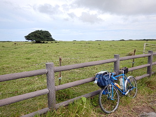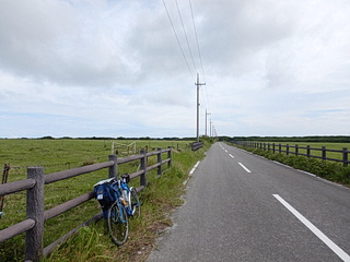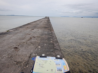 展望台の景色を眺めたら、一度 港へ戻る。これで島を半周回ったことになる。平らだし狭いしスポーツ系の自転車なら楽に回れてしまう島だと分かった。今度はハートの左上から東の方へと進んでいく。相変わらずの牧場と防風林を見ながら進んで行くと、伊古(いこ)桟橋がある。海に向かって真っ直ぐと古いコンクリートの桟橋が延びている。その先端まで自転車でゆっくり走っていく。両側の海は透明で底まで見通せる。先端では外国人の方が座って眺めていたり途中では読書をしていたりで、のんびりしている人が多い。これが理想的な島での過ごし方だ。 |