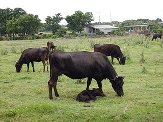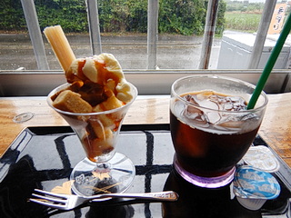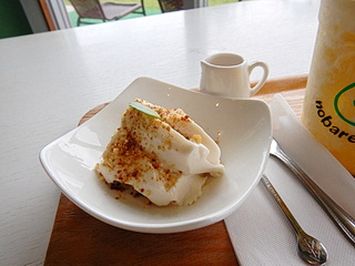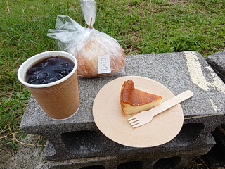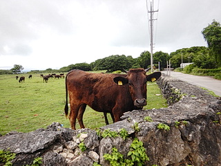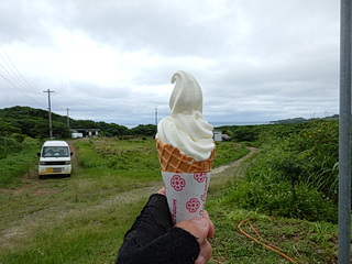 行きは向かい風だったので帰りは追い風で快適に戻っていく。牧草地と牧場を見ながら南下し、あっという間に明石まで戻ってきた。食堂に行くとものすごく混んでいたためスルーしていく。さっきスルーした鍾乳洞より南になら食堂がもう1つあるのかと思われるが、さっき通った限りでは営業してそうな雰囲気は無かった。途中の牧場でパンとソフトクリームを売ってるキッチンカーが置いてあったので立ち寄っていく。椅子とブロックが置いてあって牧場を見ながら食べれそうだ。しかし店には誰もいない。牧場にいる人に手を振ってくれと書いてるので手を振ると来た。ソフトクリームの他にミルクパンとチーズケーキとアイスコーヒーを買う。まずソフトクリームを楽しむ。ミルクの味が濃厚で美味しい。さすがにソフトクリームでは昼食にならないのでパンとチーズケーキで食事にする。チーズは濃厚でミルキーな味わいが美味しい。ミルクパンもシンプルながらしっかりした食感とミルクと麦の香りが楽しめる。石垣島の牧場を眺めながらの食事は贅沢に感じる。 |