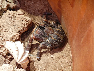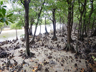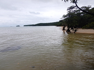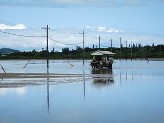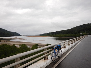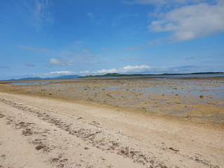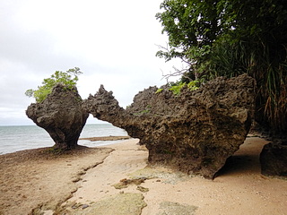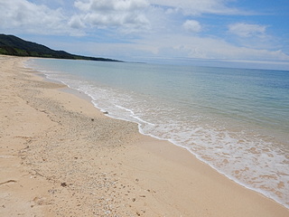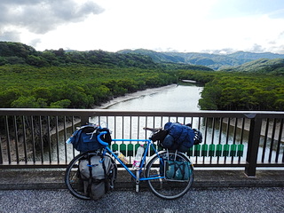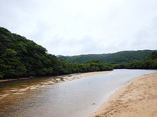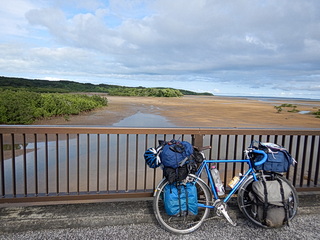 野底マーペーと呼ばれる独特の形の山を眺めながら南へと進むと、吹通川(ふきどうがわ)のマングローブ林を見下ろす橋に着く。橋のたもとの駐車場に自転車を置いて干潟に降りてみる。水面から生える根っこと背の低いヒルギと川面に森が面した亜熱帯らしい景色を満喫していく。警戒心が強く向いた方向のシオマネキは穴に潜り込むので写真も撮らせてもらえない。背を向けると穴から出てくる。何かいじめにでも遭ってるような気分である。砂の上を跳ねるトビハゼを見て波打ち際の方にも行って自転車に戻る。