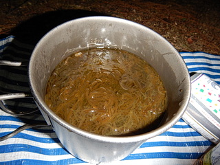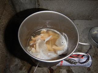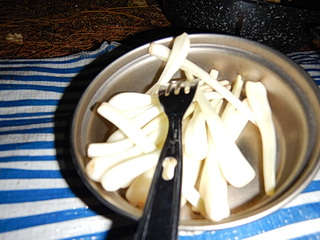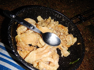 | テントの側の炊事場で夕飯を作る。まずはモズクを洗って塩抜きをする。洗うとモズクの間に水が入って量が増えていく。少しつまんで味見をして塩が残ってないことを確認して水を切る。鰹節で出汁を取って、明石の共同売店で買ってきた酢とシークヮーサーの汁を混ぜて土佐酢を作る。それでモズクを浸す。まず今まで食べたこと無いぐらいのモズク酢ができあがった。程よい酸味の中にシークヮーサーの爽やかさともちもちして柔らかいモズクの淡い磯の香りが美味しい。ふーチャンプルーを作る。まずは車麩を切って水に浸して柔らかくなったら千切って卵を吸わせる。にんじんも切っておく。野菜を先に炒めようとしたら事故とも言えるほどの失敗が起きる。モヤシは1日ぐらい冷蔵庫無しでいけるかと思ったが、袋を開けた途端に酸っぱい匂いがする。火を通せば大丈夫だろうと炒めてみたが、臭みは増してくる一方だ。これは食べてはいけないと直感的に分かる。普通の人は車で石垣市街地まで買い出しに行けるのだろうけど、伊野田ぐらいの位置で生鮮食品を売ってる店があると理想的だ。キャンプ中に使える1日分ぐらいの冷蔵庫代わりの何かも検討をしたいところだ。仕方なくフライパンからモヤシを抜いて車麩とシーチキンだけを炒めていく。炒めたら鰹節をかける。ちょっと野菜不足になってきたので、オクラと島らっきょうを積極的に食う作戦に出る。宮古島の鰹味噌を付けて島らっきょうをかじりながらビールと泡盛を飲む。車麩も香ばしさともちもち感があって美味しい。ふーチャンプルーは後日リベンジしたい。 |