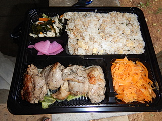 | 今日も天気は冴えない。予報では100%の雨と言われている。そして朝から左の足首に痛みが出ている。ちょっと先が心配な状況ではある。悪化するとトレッキングを予約した西表島での行動が心配になってくるし、まだまだ石垣島の走りも西表島の走りもある。石垣島に来てから暑さがなく沖縄にしては寒いぐらいの日が続いている。今日も暑さは無い。晴れて暑いぐらいが自転車旅としては理想的だが、思い通りにはいかない。足首をくねくね回して柔軟をしながら昨日買ってきた弁当を食べる。鶏肉とじゅーしー(炊き込みご飯)が美味しい。添えてあるニンジンシリシリもクーブイリチー(昆布の炒め物)も美味しい。 |