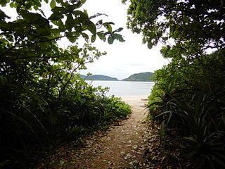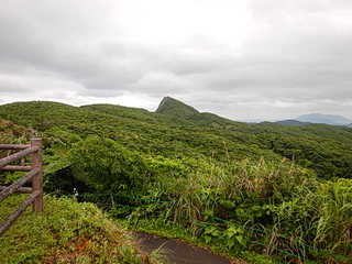坂道を上って体が温まるにつれて足の痛みが引いてきた。しばらく上ると下界の眺めも出てきた。伊野田から玉取崎の海岸線を亜熱帯の大きな葉っぱの植物の隙間から眺めながら、あえてマイナーな山道を選んだ選択の正しさを実感する。沖縄の山は標高がほとんど無いので、あっという間に展望台までたどり着いた。岩山がぴょこっと出てる野底マーペーと呼ばれている野底岳と下界の海の眺めを楽しむ。天気は悪くとも海の色は鮮やかさがある。足が元気だったら野底岳に上るのもありだが、足首に不調を抱えていてSPDサンダルなので無理はできない。 |