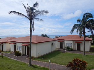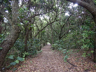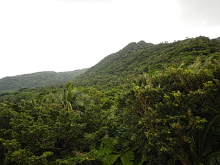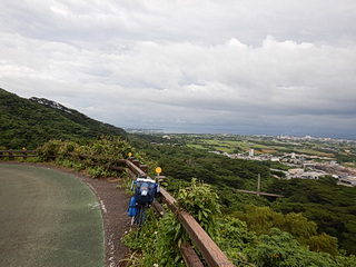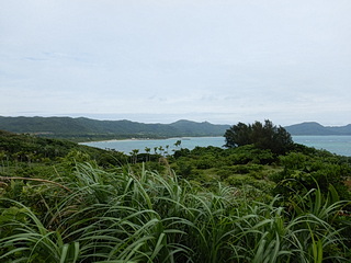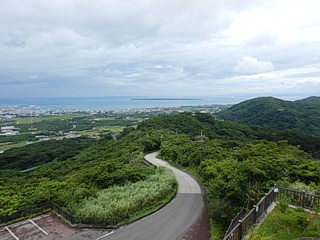 | 鍾乳洞を出たらバンナ岳の道を上っていく。標高230mの展望台が目標で、今までに無いぐらい急な坂をぐいぐい上っていく。さすがに標高が高くはないので、さほど時間はかからず登り切ってしまう。景色を見下ろすと石垣の市街地が一望できる。こうしてみると背の高い建物はないものの都会的ではある。その向こうは海と島が見渡せる。晴れていればエメラルドの海を見る展望台という名前だけあってきれいな海の色が楽しめるのだろうけど、今日はくすんだ色になっている。それでも高いところまで上り詰める喜びは何にも代えがたい。下りながら展望台に立ち寄ってはみていく。島の内陸も牧歌的で石垣島の広さを感じる。 |