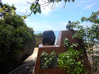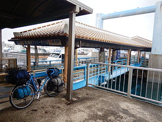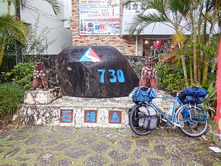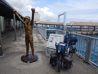 ホテルを出て、まずは港へ行く。港からは八重山諸島の離島へ行くフェリーが何本も出ている。フェリーと言っても旅客だけの高速船である。一番の不安は各離島にフル装備の自転車を運べるかだが、乗せるための間口は十分に広そうだ。西表島に渡る際の段取りを確認し、具志堅用高像の写真を撮っていく。GWに入ってるからか写真を撮る人が次々と来るので最低限の写真を撮って後にする。 港から出てすぐの場所にある730記念碑で写真を撮る。ここが国道最西端となる。沖縄の道路を一斉に右側通行から左側通行に切り替えた日を記念して作られた石碑であり、沖縄の国道の起点にあるのが良い雰囲気を出している。今回の旅としては端っこを先に制してしまうが、390号を完全走破するのが目標の1つである。 |