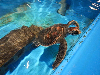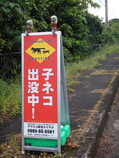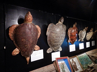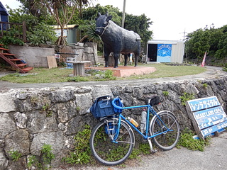 あっという間に黒島に到着した。ハート型の島の北西の港に上陸したら、西側から回っていく。海岸ギリギリの道はダートから始まる。レンタサイクルで回ってるぐらいだから路面は大きくは荒れていない。26インチのタイヤなのでオンロード用とは言え悪路には少し強い。島の外から見ても山がない平らな島なのでアップダウンは無いに等しい。少し走ったところで土手のような地形を越えて海に出る。流れが速いからか遊泳禁止ではあるが、プライベートビーチの向こうに八重山の島々が見えている。何も無いことを楽しむ島とは聞いていたが、これが黒島の楽しみ方だろう。琉球石灰岩の石垣で囲まれた牧場を見ながら回るダートは黒島独特の景色だろう。海側は土手のようになって木が茂っているのでずっと海を見ながら走るわけではなく、人の気配はないが牛の気配だけがある素朴な島の道を楽しんで行く。 しばらく進むと黒島研究所と呼ばれている唯一とも言える見所に着く。何故、研究所と言う名称なのか、何があるのか謎が多い場所で気になっていた。黒島に流れ着いたロケットの残骸などの漂流物や黒島の生物などが展示してある。固有種や外来種の問題にも触れていて、とにかく展示内容が丁寧で細かい。生物学が好きな私にはたまらない内容だ。飼育されているクジャクは外来種の問題を示唆している。小浜島のリゾートで飼っていたクジャクが逃げて石垣島や黒島にも定着している。敷地の外側になるとウミガメや魚が飼育されて餌付けも出来る。ワクワクしながら餌を買ってあげてみると、水をバシャバシャしておねだりしてくるウミガメが可愛い。黒島研究所のオリジナルタオルハンカチを買って後にした。 |