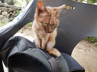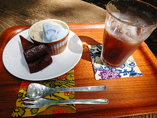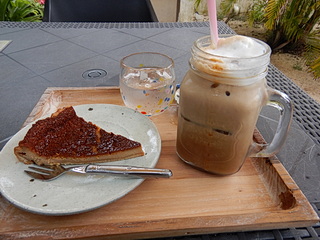 | 島の中心へと入っていく。途中で牧場の写真を撮っていく。琉球石灰岩の石垣の中に牧場があり、人懐っこい牛が寄ってきた。防疫とか考えると撫でたり触ったりは避けるが、石垣と自転車と牛という独特の写真を撮ることが出来た。牛と戯れると猫もいた。猫は道路を越えて家の方へと戻っていく。その家がカフェなので立ち寄る。店の外でパラソルの下のテーブルとベンチに落ち着く。さっきの猫は人懐っこくテーブルの上や膝の上にのってくる。黒糖ラテと黒糖チーズケーキでおやつを楽しむ。チーズケーキに乗ってるコクのある黒糖がベイクドチーズケーキと意外と合う。のんびりした時間を亜熱帯の植物と猫と黒糖のお菓子で楽しんで行く。 |