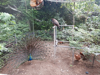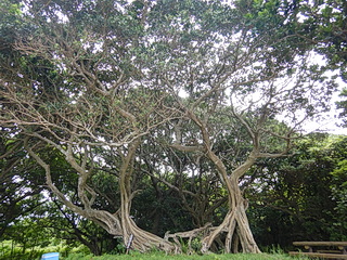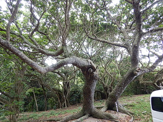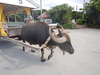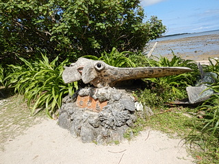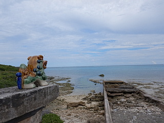 中心部から島の南東の方へ行く。中心部から何カ所かに真っ直ぐ伸びる道があるだけで回ることはできない。ガイドブックにキャングチと書かれている海岸まで走る。狭い黒島なので走り始めたらあっという間にたどり着いてしまう。海に向かっているシーサーと壊れた桟橋が印象的な景色である。喜屋武御嶽と呼ばれてる祠が見えるが、沖縄は道路から外れると地元の聖域があるので、うかつに歩き回れないところがある。謂れが分からない場所は慎重に行く。島の中心部に戻って、そろそろ港に向かいつつの見物に頭を切り替えていく。黒島展望台を通らず仲本海岸の方へ行く道を走っていくと、これぞ黒島という景色に出会う。牧場の中にガジュマルの木が生えて木陰で牛が休んでいる。ガジュマルの蔓が下にいっぱい降りて神が宿りそうな姿の下に牛が休んでいる姿こそ沖縄の牧場という感じがするし、この景色は黒島でしか見たことが無い。牧場の中でクジャクのつがいも見つけた。 大満足のうちに港に戻ってきた。フェリーまで1時間以上の待ち時間がある。港のすぐそばの西の浜で海を見て戻ってきて、まだ30分近くあるのでベンチで日記を書いて待つ。島での時間の潰し方とか使い方の下手さは感じるし、これからの旅に向けての改善課題だろう。無理して改善するものではないが、のんびり出来るともっと新しい価値を感じられるのでは無いかという旅人としての期待値がある。それを実感する島が黒島ではないかと思う。だが、まったりとアグレッシブに走りまくる旅でも黒島は十分に味わえた。もしかすると、この何もない黒島に1泊とか2泊するぐらいの余裕が俺には必要ではないかとも思える。 |
