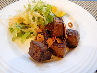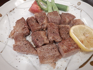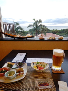 今日は打ち上げなのでぱーっと行きたい。港の近くの飲み屋街を歩いてると、ネットで見つけた石垣牛のお店に入る。入ると言っても横町のようなところでオープンな感じでテーブルが並んでいる。座るとまず石垣牛とゴーヤーチャンプルーとモズク酢を頼み、女将の薦められるままにおすすめを頼んでみる。隣に座っている地元民かと思う旅人と話が盛り上がる。料理は美味しいし、アンマー(おかあさん)と呼びたくなる女将さんの雰囲気は旅の打ち上げを楽しませてくれる。次々に来る客と会話は盛り上がっていく。俺にとっては旅の最後の晩餐で最も楽しみにしていた石垣牛のステーキを満喫する。最高の打ち上げになった夜に大満足して眠りについた。 |
